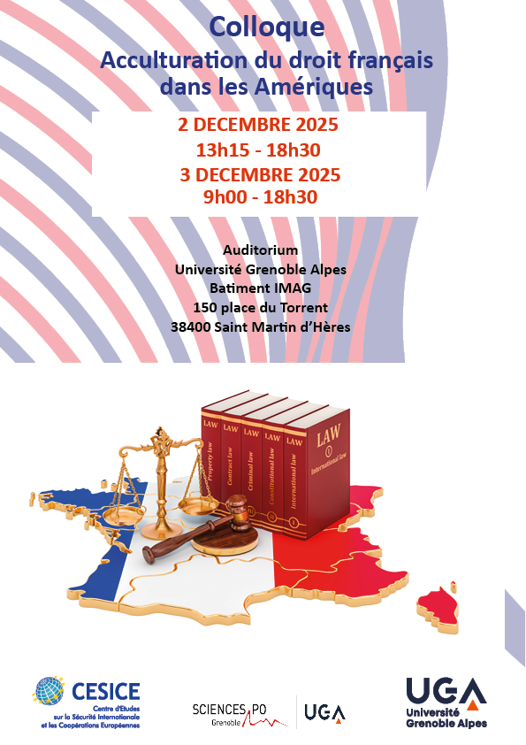 Le CESICE organise un colloque en distanciel intitulé "Acculturation du droit français dans les Amériques" le 2 décembre 2025 de 13h15 à 18h30 et le 3 décembre 2025 de 9h00 à 18h30